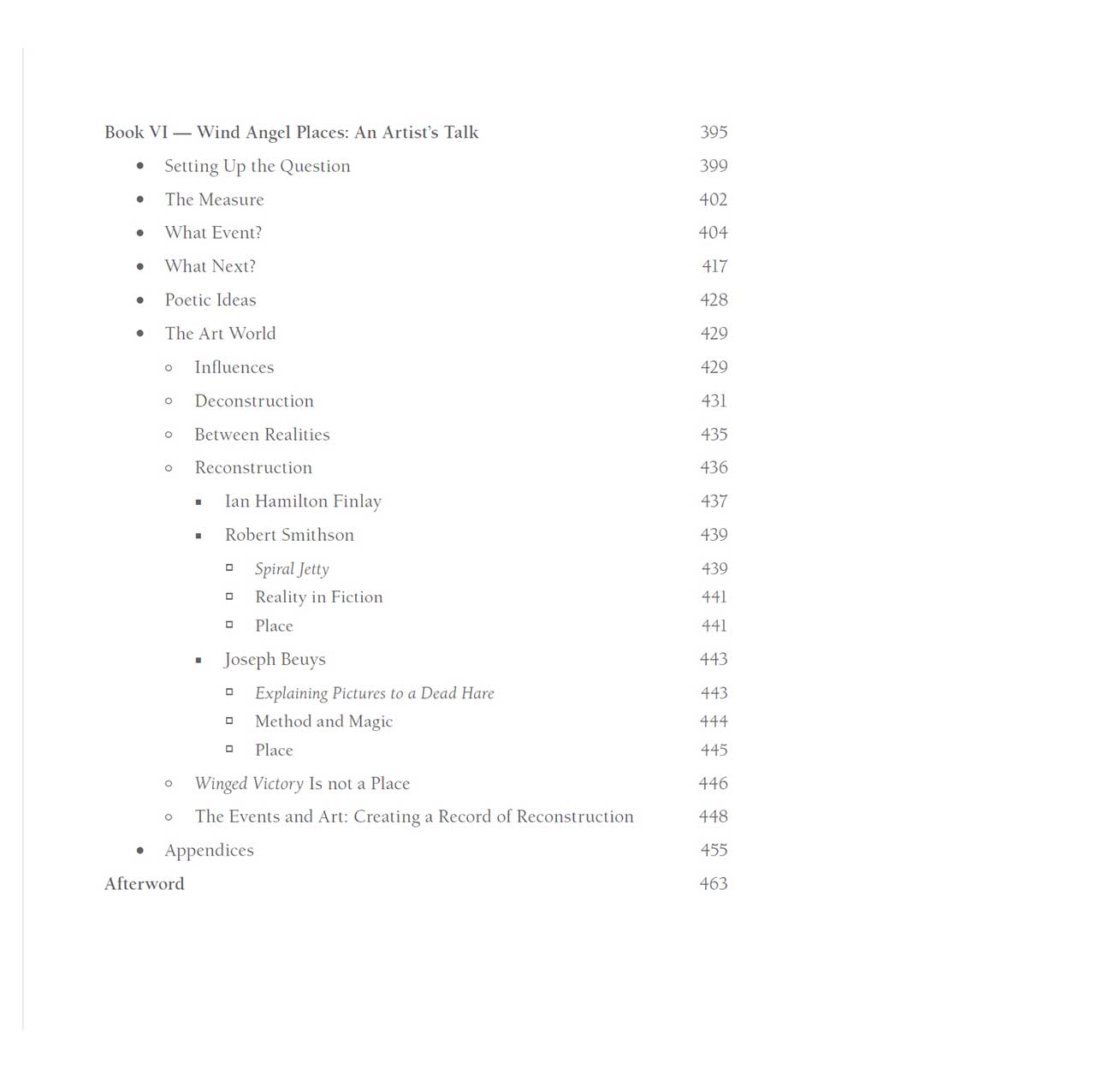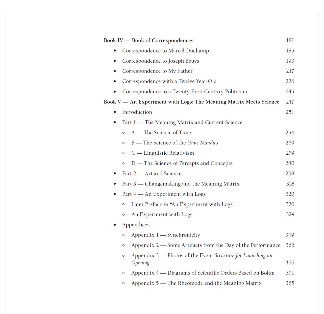 In ‘Book IV: Book of Correspondences’, and ‘Book VI – Wind Angel Places: An Artist’s Tale’, the relevance of the meaning matrix to modern art is explored via connections to Duchamp, Beuys, Smithson, and Hamilton-Finlay. The role of art in the crisis of truth is elaborated, and modern art is interpreted as parallel processes of deconstruction and reconstruction. The meaning matrix is situated as reconstruction.